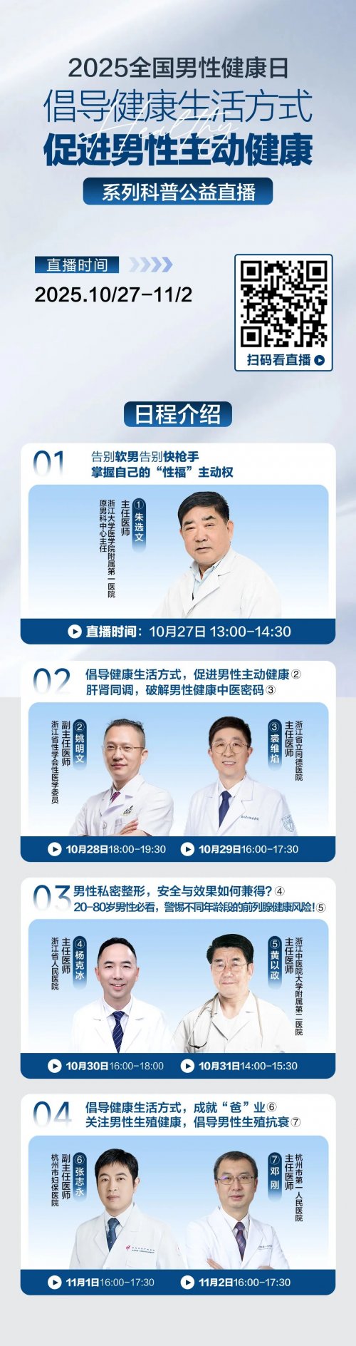 杭州阿波罗医院于10月27日-11月2日,连续举办7场干货满满的线上公益直播活动,用实际行动为男性健康保驾护航!